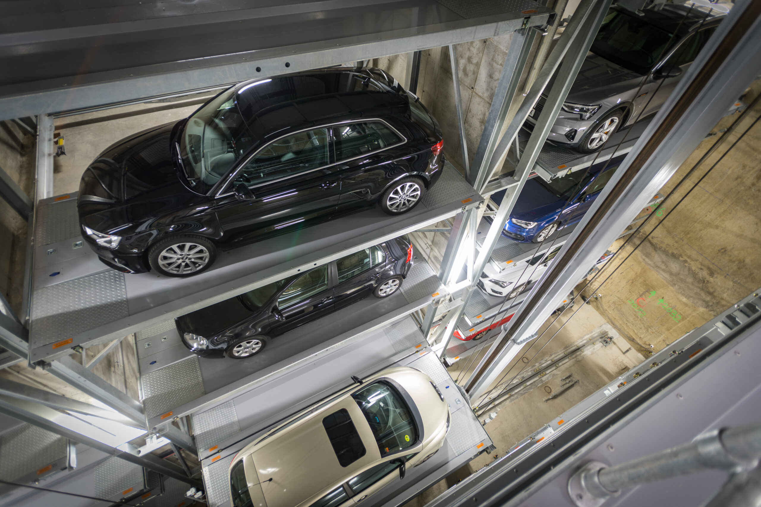 I ett trevåningssystem placeras en bil på körbanenivå, en i en fördjupning och en ovanför de andra. På körbanenivån finns en ”tom bricka i spelet”, vilket möjliggör omflyttning av bilarna så att alla platser alltid är lättillgängliga. Beställ din p-plats med RFID-bricka, app eller fjärrkontroll för bekväm hantering av din p-plats.
